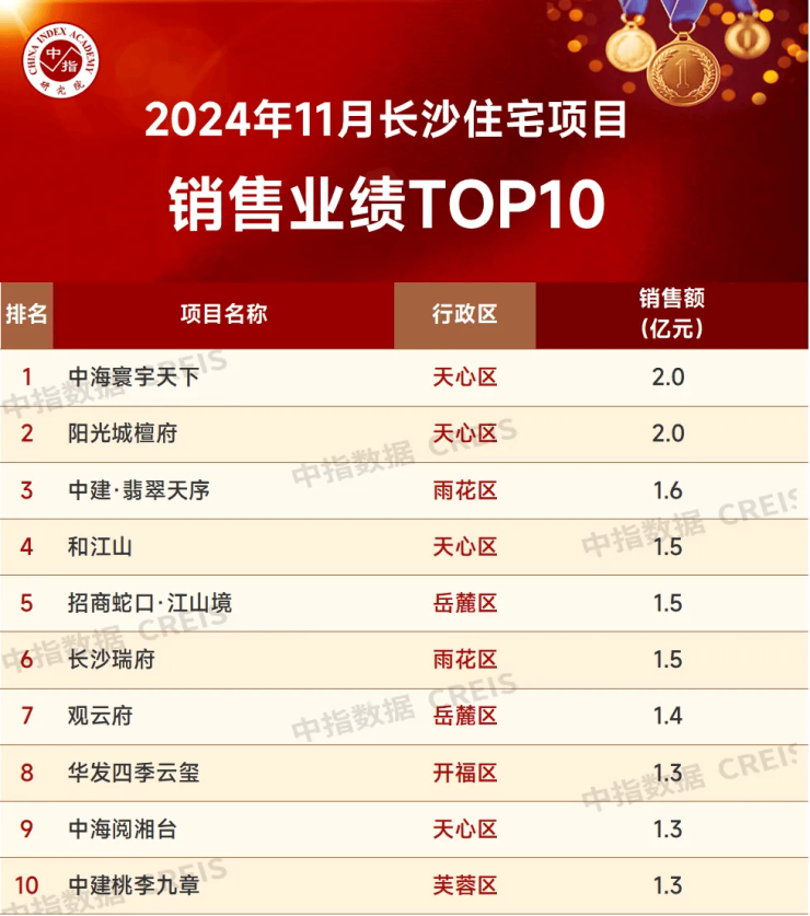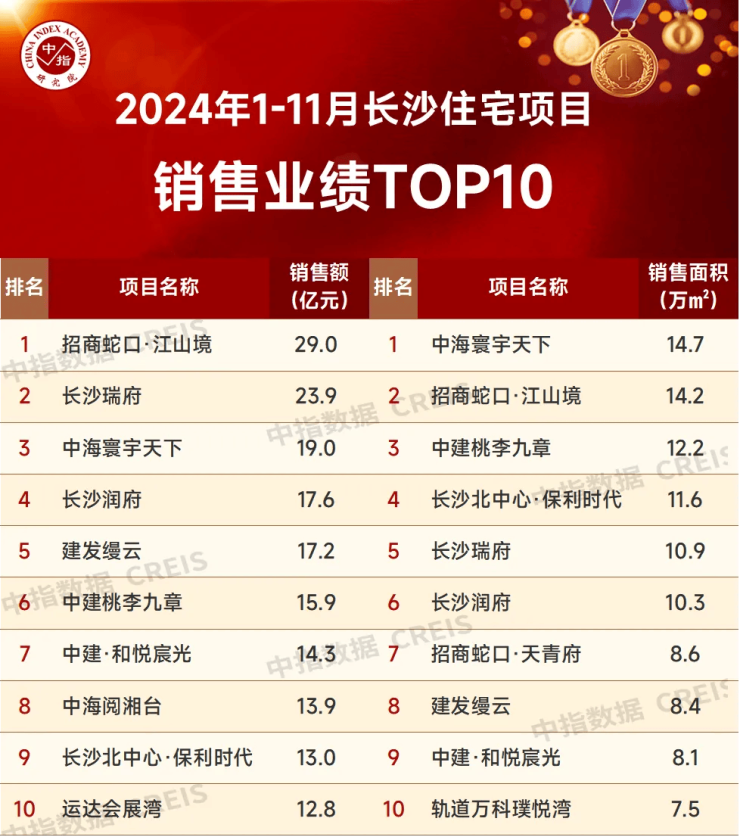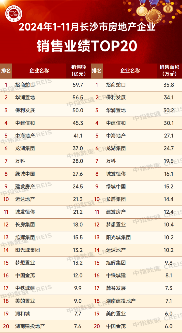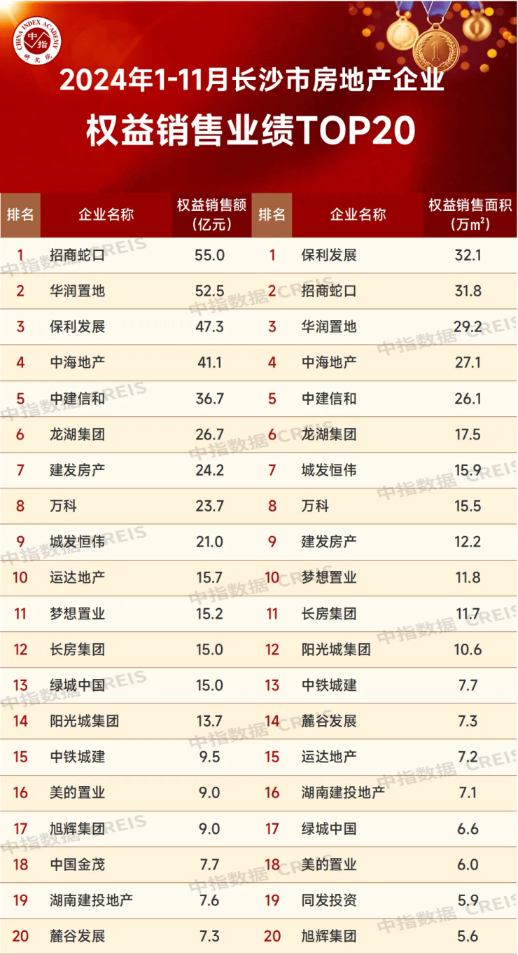 特别声明:房地产企业销售数据统计是以2024年1月1日-11月30日期间销售的商品房为统计口径,主要依据中指数据CREIS(点击查看)在长沙市内五区的销售监测数据,并参考企业提供的相关数据,经课题组严格审核纳入统计,涉及合资项目,销售数据划归于操盘企业。本报告仅供参考,课题组不对使用报告及其内容所引发的任何直接或间接损失承担责任。