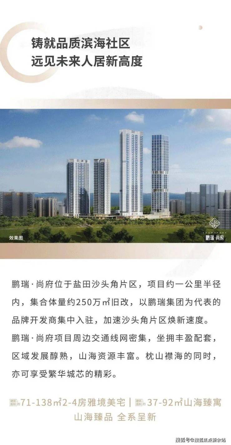 深圳鹏瑞尚府位于盐田区沙头角,是集品质住宅、精奢公寓、艺术办公等为一体的滨海综合体。项目坐拥山海景观,临近沙头角口岸,交通便利,且周边学校、商业等配套设施完善。鹏瑞尚府以高品质著称,提供多样化的户型选择,居住舒适度高,是城市人居典范。