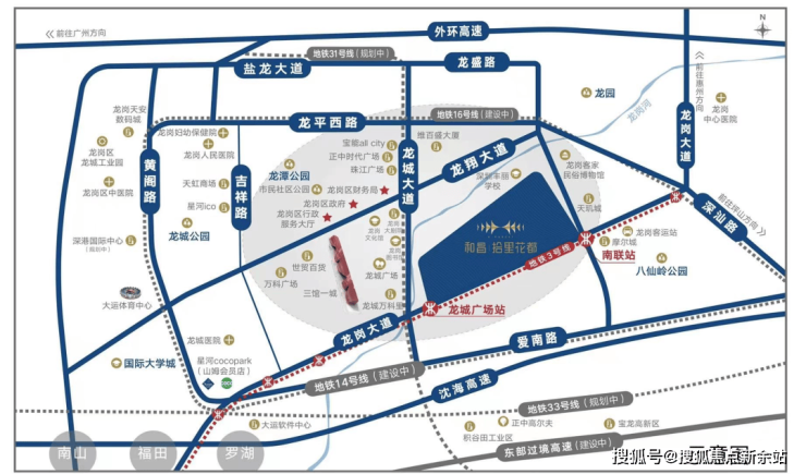 地 铁:3号地铁龙城广场站200米,南联站,14.16号线(在建)21,33号线(规划)