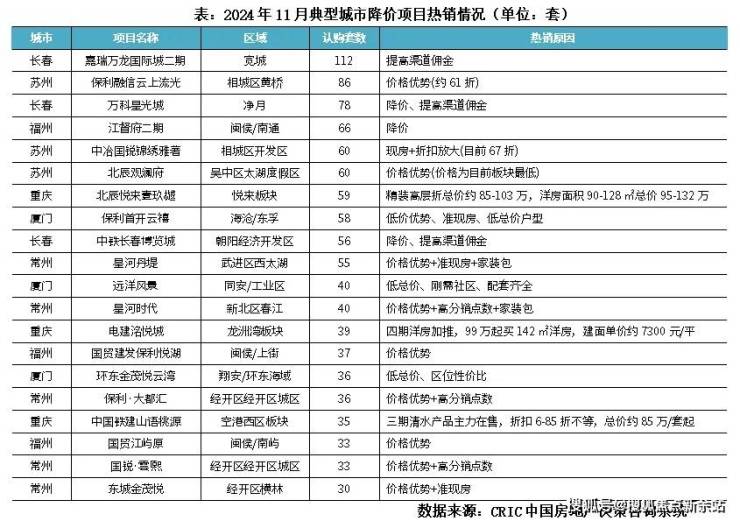 二线城市热销项目中,长春宽城区嘉瑞万龙国际城二期项目通过提佣方式促进11月认购112套,重庆中国铁建山语桃源以价换量,折扣力度达到6-85折;重庆电建洺悦城项目四期洋房加推,99万起买142平洋房,建面单价低至7300元/平方米。而福州江督府二期项目,沿江房源降价约1000元/平方米,6字开头,价格优势显著。三四线以常州为典型代表,11月成交套数TOP10项目中,以价换量仍是主导,刚需盘价格再次下探,另外通过赠送家装包等形式加大促销力度,成交量保持高位水准。其中星河丹堤精装准现房12000元/平方米起,星河时代精装高层11500元/平方米起,另外赠送8-10万家装包;保利大都汇最低6折+最高4.8%分销点数;11000元/平方米起;东城金茂悦69折等;这也使得多个刚需盘成交套数长期霸榜前十。