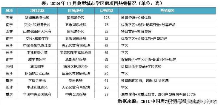 改善盘往往凭借核心区位和健全配套获得购房者青睐,而当前学区改善越来越成为购房者核心关注点,尤其对于长沙、西安、南宁等内陆城市而言,强教育属性楼盘仍可在低迷的市场行情中异军突起。下表我们罗列了11月部分热销的学区房项目,主要是通过优质的教育资源获得销售佳绩。