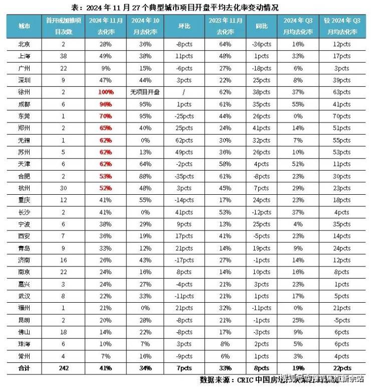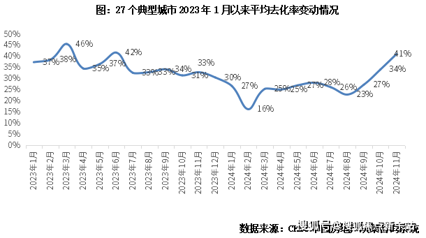 纵观2023年以来27个典型城市月度平均去化率变动情况,基本呈现出波动下行态势,2024年2月触底后开始企稳回升,尤其是2024年9月新政以来节节攀升:据CRIC监测数据,2024年11月27城项目平均去化率仅为41%,环比上涨7个百分点,同比上涨8个百分点,与2023年以来波峰46%仅有5个百分点的差距。