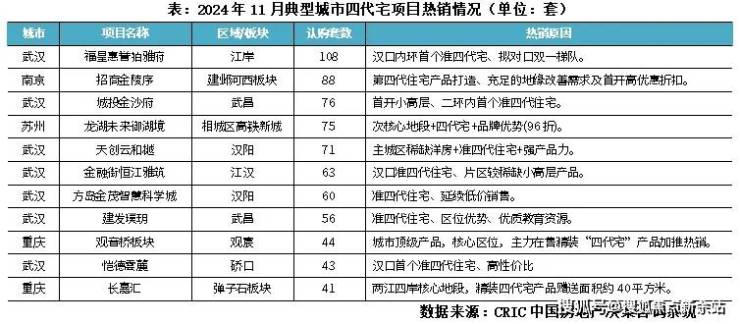 再如武汉,2024年11月商品住宅项目认购TOP20的项目中有7个均为四代宅/准四代宅项目,占比高达35%。其中福星惠誉铂雅府、金融街恒江雅筑项目主要凭借稀缺业态属性及优质配套获得市场高热度。福星惠誉铂雅府为汉口内环首个准四代宅,拟对口双一教育梯队,教育资源优质、配套成熟首开超高层、小高层,其中小高层得房率90-95%,为首开成交主力,去化速度明显快于超高层。金融街恒江雅筑项目为汉口二三环准四代住宅,综合得房率超90%,项目体量小,仅3栋楼,小高层为片区较稀缺产品,市场热度较高。