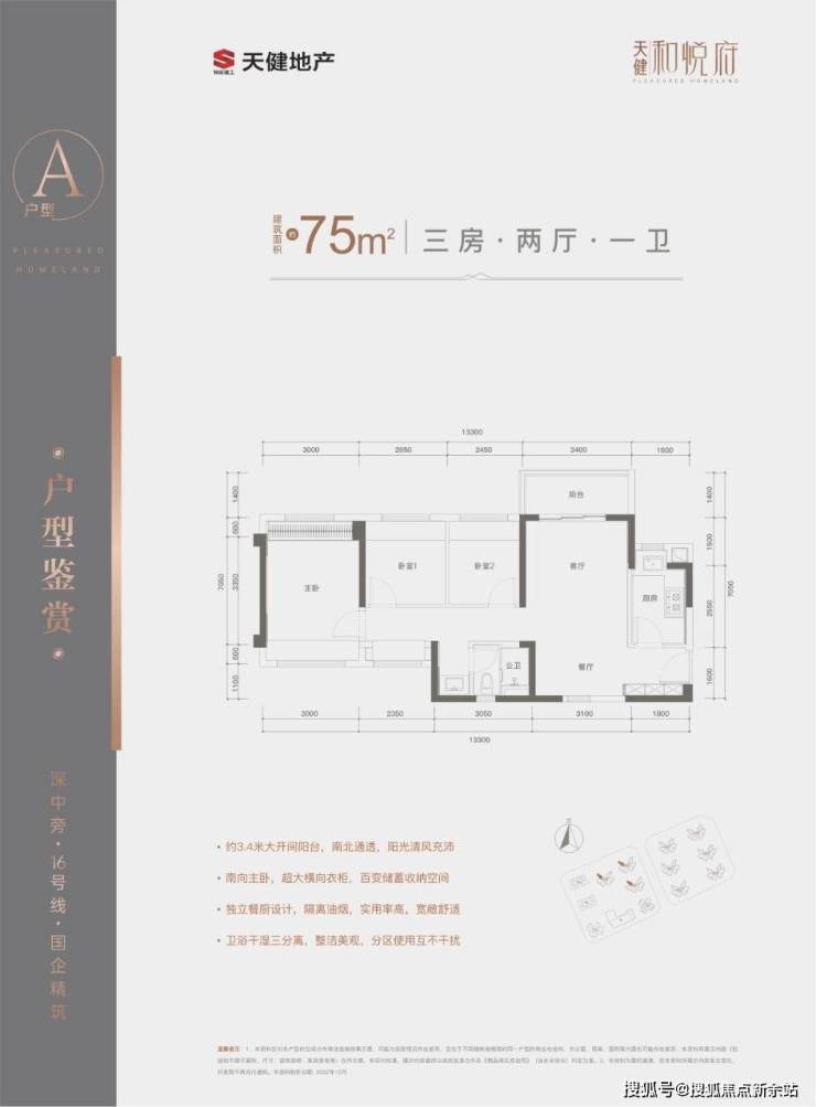 户型面积布局A75平三房两厅一卫设计的是竖厅南北通透格局,进门入户玄关,客厅3.4米开间,L型厨房,卫生间三段式分离,得房率81.3%(不含赠送),阳台朝西北或东北向。