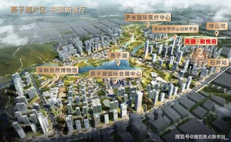 2021年深圳两会提及加快建设9大区域,包括燕子湖新区,坪山十四五提出“1+7+N”重点片区格局,1为燕子湖,市级区级双重背书,高标准打造定位东部城市新客厅。