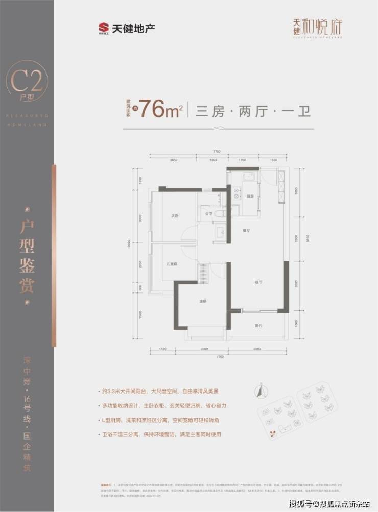 户型面积布局C276平三房两厅一卫设计的是竖厅格局,进门入户玄关,客厅3.3米开间,L型厨房,卫生间三段式分离,得房率75.05%(不含赠送),阳台朝西北、西南或东北向。