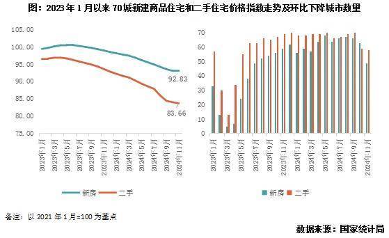 以2021年1月为基点来看70城新建商品住宅和二手住宅价格指数走势,11月份房价下跌趋势持续趋缓。新房整体较2021年初下降7.2%,二手房较2021年初下降16.3%。一手房环比下降0.2%,月内有17个城市房价环比上升,比上月增加10个,为年内最多,二手房环比下降0.4%,月内有10个城市房价环比上升,比上月增加2个。统计局发布数据显示,各线城市同比降幅今年以来首次均收窄,整体来看一手房价的同比降幅也在2024年11月首次出现了收窄。