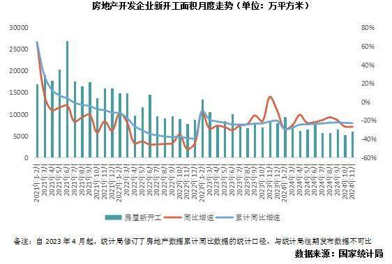 1—11月份,房地产开发企业房屋施工面积726014万平方米,同比下降12.7%。其中,住宅施工面积508389万平方米,下降13.1%。房屋新开工面积67308万平方米,下降23.0%。其中,住宅新开工面积48989万平方米,下降23.1%。房屋竣工面积48152万平方米,下降26.2%。其中,住宅竣工面积35197万平方米,下降26.0%。