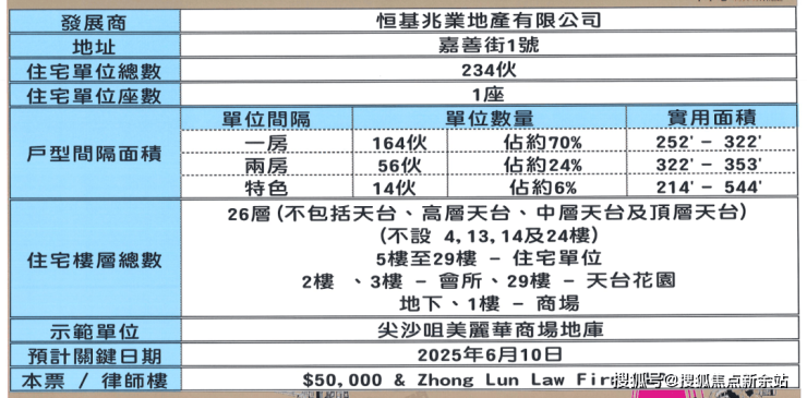 利奥坊·首隅位于嘉善街1号,独栋蝴蝶型设计,共29层高,提供614伙单位,标准户型由开放式至两房单位,其中1房单位占约7成。住宅层数5-29楼(不设13、14和24楼),每层各设11伙单位,合共提供234伙分层住宅。层高3.5米户户采用开放式厨房设计,门后随楼赠送嵌入式柜体,露台与工作平台合二为一。