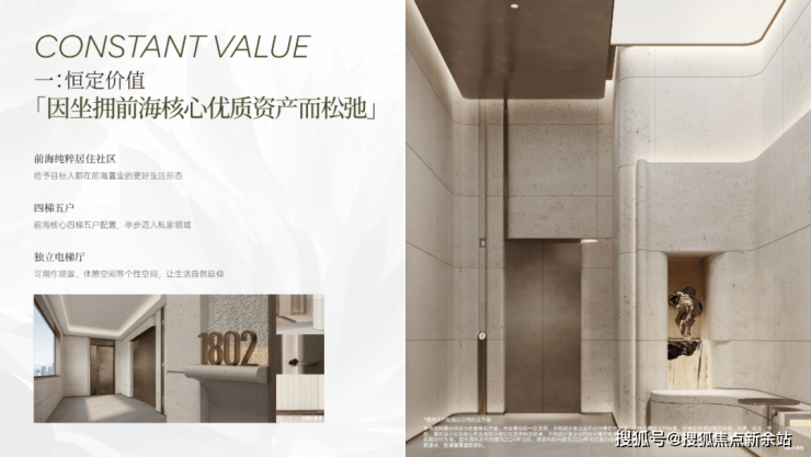 梯户比为4梯5户,在前海3梯4户、3梯5户是主流,湾啟紫荆府做到了4梯5户,而且能做到每户独立电梯厅,当下在售的新房有独立电梯厅的都是大户型豪宅。