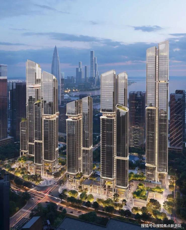 后海沄玺花园旨在打造城市次地标,设计灵感来自植物细胞的有机形态。项目由五座150-250米塔楼组成,采用错落布局和平面退台设计,以优化深圳湾景观视野。