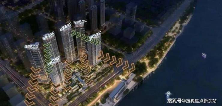 由保利地产顶尖设计团队操刀(核心设计师曾主导保利冼村顶豪项目),采用 “铝板 + 玻璃幕墙” 的公建化立面设计:主体选用深灰色氟碳铝板,搭配香槟金金属线条勾勒轮廓,底部基座采用干挂石材增强厚重感;大面积 Low-E 中空玻璃占比达 60%,既隔绝噪音与紫外线,又使建筑在阳光下呈现晶莹剔透的光影效果,与珠江水面形成 “江楼共映” 的视觉美学。建筑高度呈北高南低的梯级变化,1#(35 层)、9#(37 层)为中高层,3#、5#(50 层)、6#、8#(49 层)为超高层,既保障每栋楼的江景视野,又形成错落有致的城市天际线。