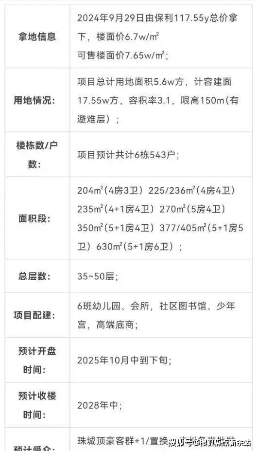 项目总占地 56080.65㎡,总建筑面积 175561㎡,容积率仅 3.1(广州核心区江景豪宅最低容积率之一),由 8 栋围合式建筑构成,规划住宅 543 户。物业由保利物业提供(国家一级资质),物业费预计 12 元 /㎡・月,将提供 24 小时礼宾、私人管家、会所运营等高端服务(参考济南保利臻誉、宁波江上印等标杆项目服务标准)。