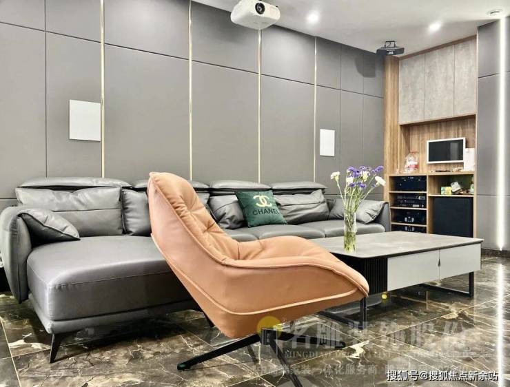 影视厅的家居与饰品,也以简单直观的方式,为空间注入现代时尚个性。沙发与茶几,一灰与一白,款式简单但不失创意之态,经典爱马仕橙座椅在颜色碰撞里暗带张狂。这般搭配,似简不简,心思并不少。