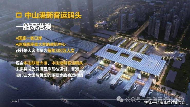 中山港新客运码头,为国家一级口岸,预计最大客流量可达300万人次/年,连接黄金内湾100公里,也将带来不可估量的客流红利!