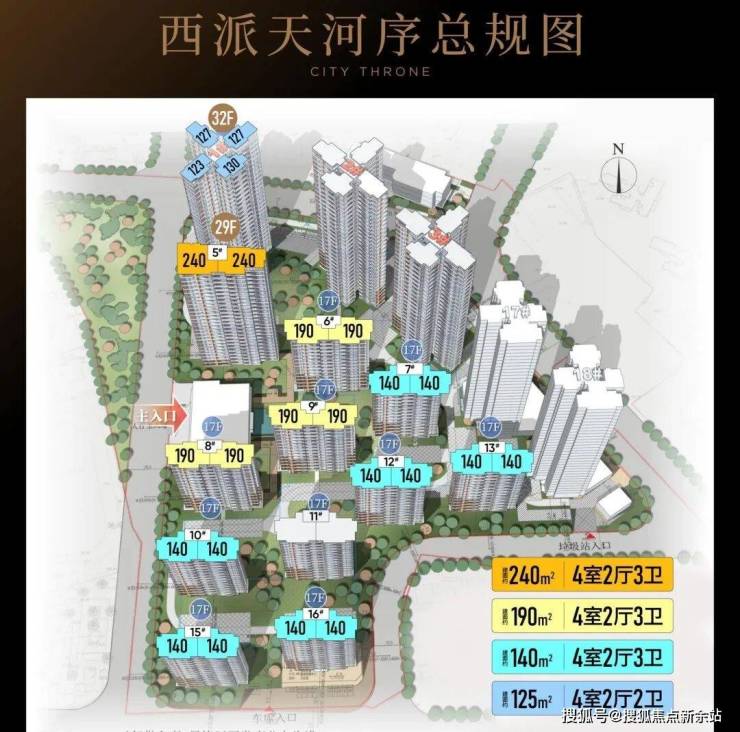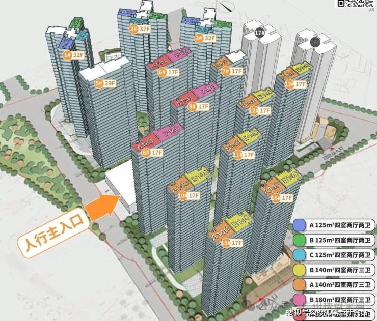 1-3号楼,120-143平,2梯4户,塔楼,层高3米,总层高32层。