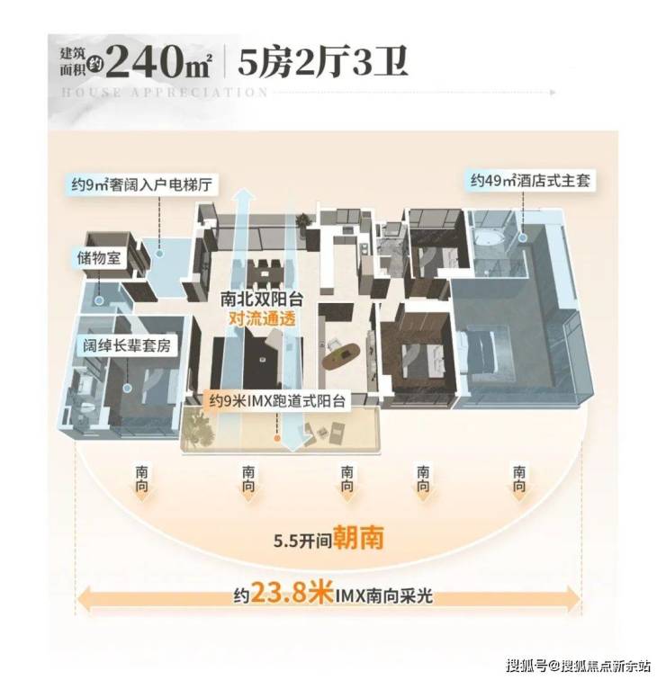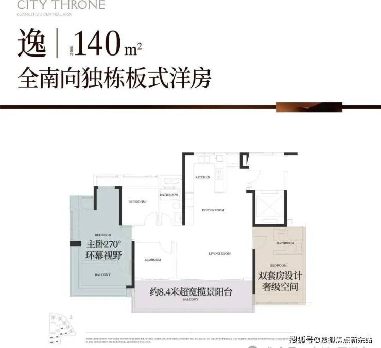 约8.4米南向巨幕阳台,主卧270°飘窗,能最大程度引园景入室。