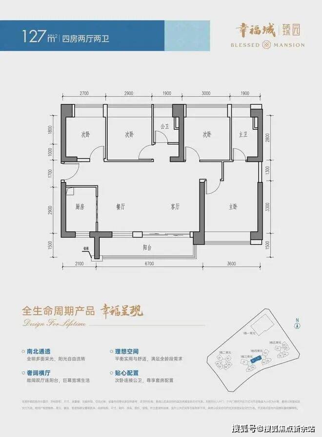 横厅南北通透,6.3米客餐厅,8飘窗,得房率84.87-87.1%,主朝西南/东南。