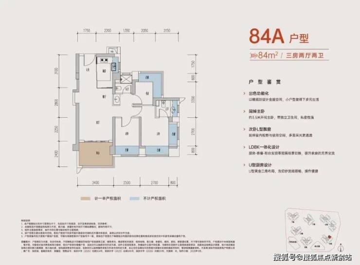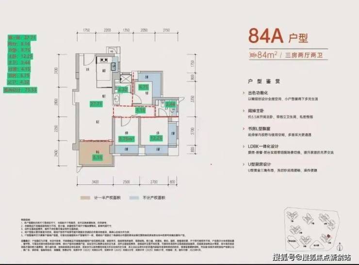 84㎡三房两卫:下图84平计算下来的套内使用面积,约75.5平(含赠送),使用率达90%!使用空间可媲美传统90㎡户型,是极致刚需上车的利器。