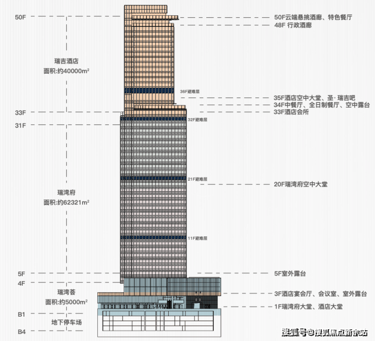 (5-19层底区,20-31层中区,33-51层瑞吉酒店)