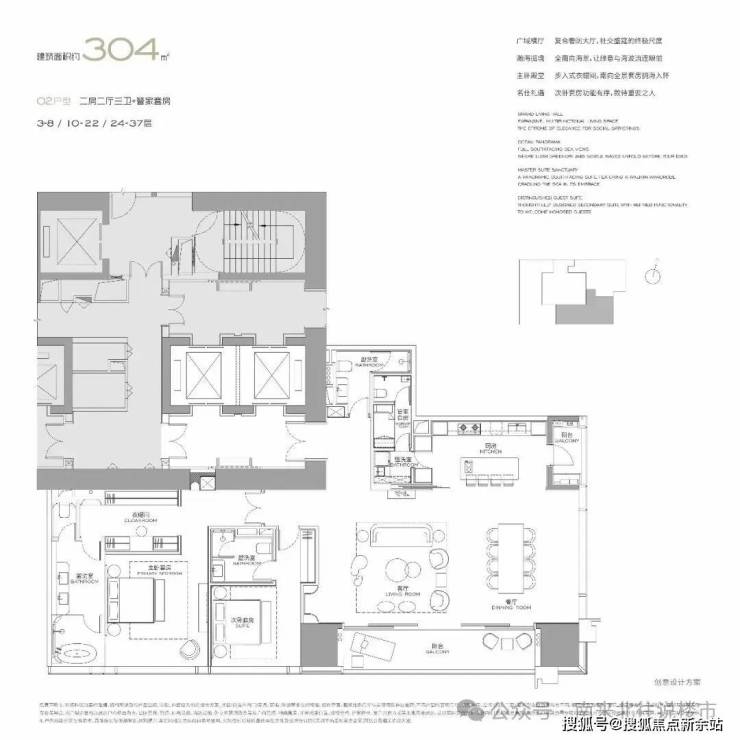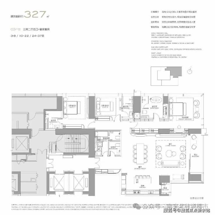 【户型规划】由4栋51至63层3.6-3.9米层高的纯居住奢装交付地标、两栋4.5米层高的小高层,35栋独栋,全景幕墙、宽景阳台。