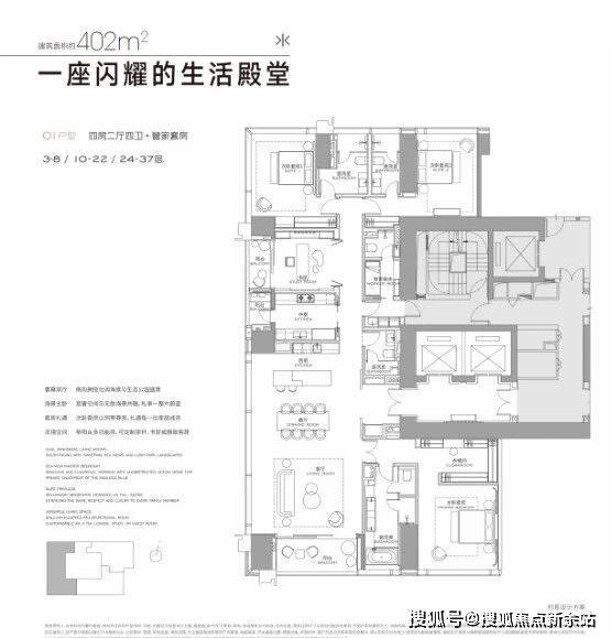公寓面积段覆盖300-1000㎡(具体包括300㎡、400㎡、460㎡、570㎡、1000㎡等大平层),起步户型预计200㎡以上,主打“总裁级大平层”,满足高净值人群对空间尺度与私密性的需求。