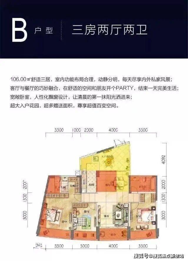 106.00㎡宽敞三居,室内功能区分明确,动静分明,每天独享内外私家风景。客厅与餐厅融汇相通,在舒适的空间内开个PARTY,尽显主人心境;宽奢卧室,人性化飘窗设计,让清晨的第一抹阳光洒进来;超大入户花园,超多赠送面积,尊享超值百变空间。