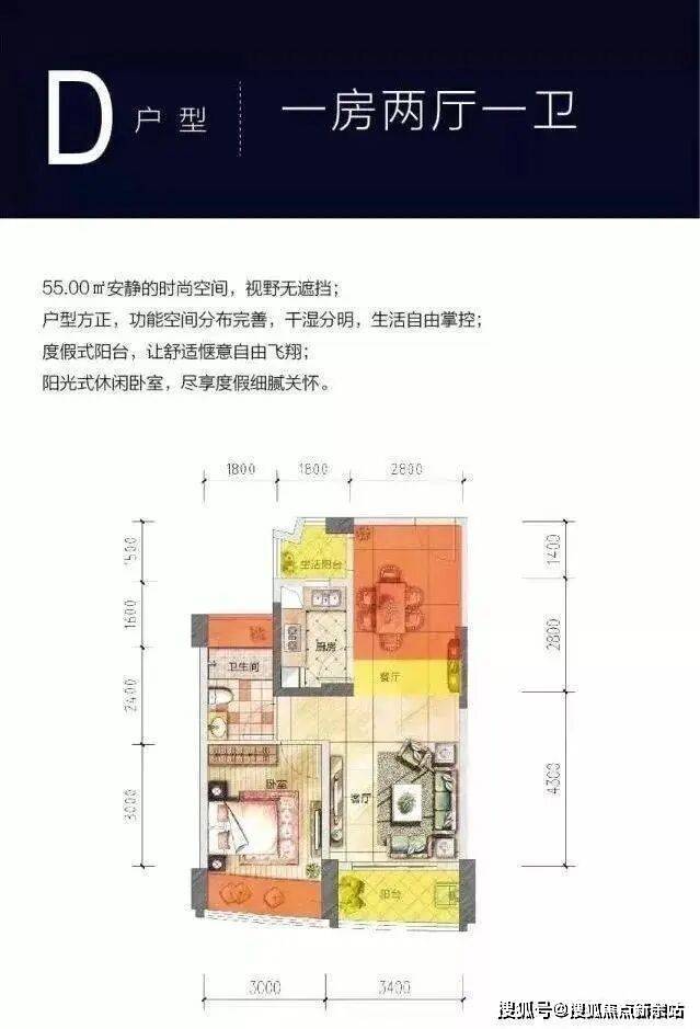 55.00㎡舒适安静的时尚空间;户型方正,功能空间分布完善,干湿分明,生活自由掌控;度假式阳台,让舒适惬意自由飞翔;阳光式休闲卧室,尽享度假细腻关怀。