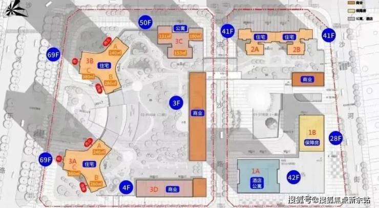 占地4.2万㎡,容积率6.63,分为两期不同地块。一期为1栋A座为150米高公寓+酒店、1栋B座为92米高保障房、2栋A/B座位为138米回迁住宅。