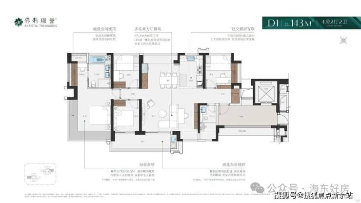 - 143㎡4+1房二卫(横厅绝版):首推1-2栋05户,位于小区中心,约13㎡专梯入户空间可灵活改造。LDKB横厅开间超10米,无过道浪费,动区开阔;阳台外飘设计,低区可看小区立体花园与街心公园,高区可侧览海景,目前已彻底售罄,后续无补推。