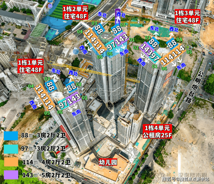 光明公明北,特发学府朗园于2023年11月10日取证入市,本次推出1栋1/2/3单元,共790套房源,面积有88-97㎡的3房2卫,114㎡的4房2卫,143㎡的5房2卫户型,备案总价4.44万/㎡,备案单价3.81-5.07万/㎡,总价337-729万/套,计划在2025年12月前带简装交房。