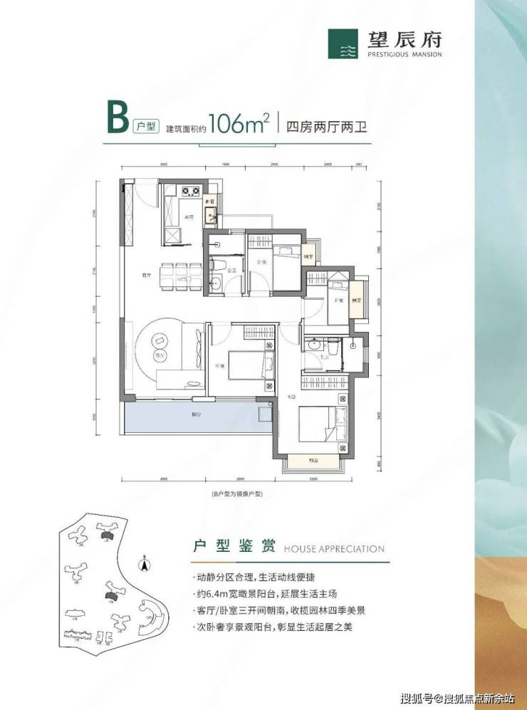 竖厅南北通透格局,客厅3.6米开间,四开间朝南,4个卧室分别是3.2米/2.9米/2.7/2.2米,全屋飘窗设计,U型厨房,得房率78.39%,6.3米长的超大阳台,主朝东南或西南向,看花园景观。折后347-360万