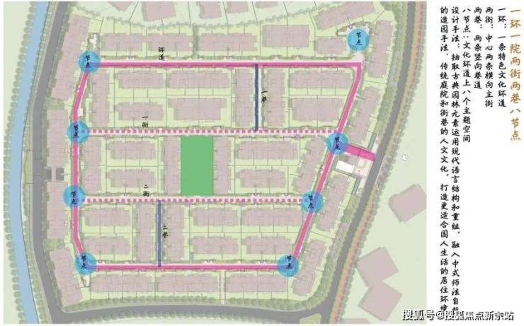 岭南院子的园林采用的是岭南新中式风格,整体设计采用一环、一院、两街、两巷、八节点的的设计。