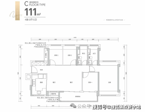 111㎡的4房2厅2卫,设计的是横厅南北通透格局,进门入户玄关,客餐厅5.8米开间,客厅连接次卧出6.4米长的大阳台,主卧南北通透设计,4个卧室分别做到了3.2米/2.6米/2.35米/2.25米的宽度,U型厨房,卫生间干湿分离,得房率:80.86%(不含赠送),阳台主朝西南或东南向。