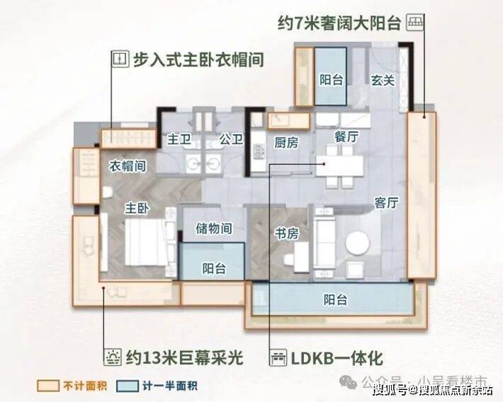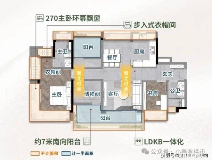 建面113平四房,经典竖厅设计,LDKB一体化设计,主卧步入式衣帽间,带独立入户花园。