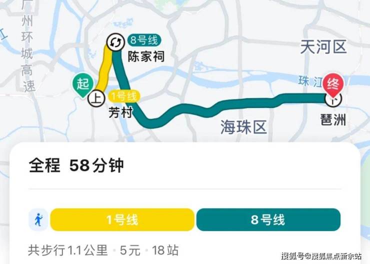 地铁去往琶洲:乘坐1号线到陈家祠换乘8号线,再到琶洲,全程18个站,总共耗时58分钟。