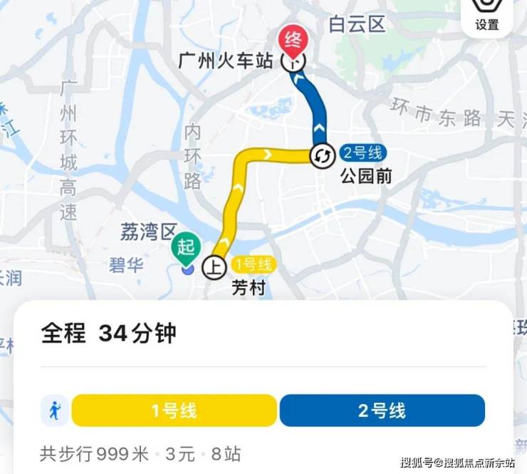 地铁去往火车站商圈:出小区步行至芳村站,乘坐1号线到公园前换乘2号线,再到广州火车站,全程8个站,耗时34分钟左右。