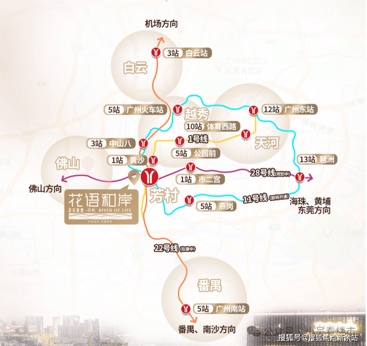 项目距离1号线地铁芳村站约800米,步行12分钟即可到达,通过已经开通的1号线和广佛线,无需换乘,可一轨直达越秀天河等地,附近还有11号线、在建的22号线、规划中的28号线,从项目过去都是只有百米的距离,未来去往各地都非常方便,自驾的话,周边有芳村大道、花地大道等线路。