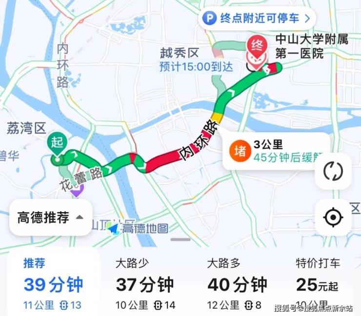自驾去省人民/中山大学附属医院:出小区走芳村大道转洲头咀隧道,再上内环至东华南路,全程11公里,耗时39分钟左右。