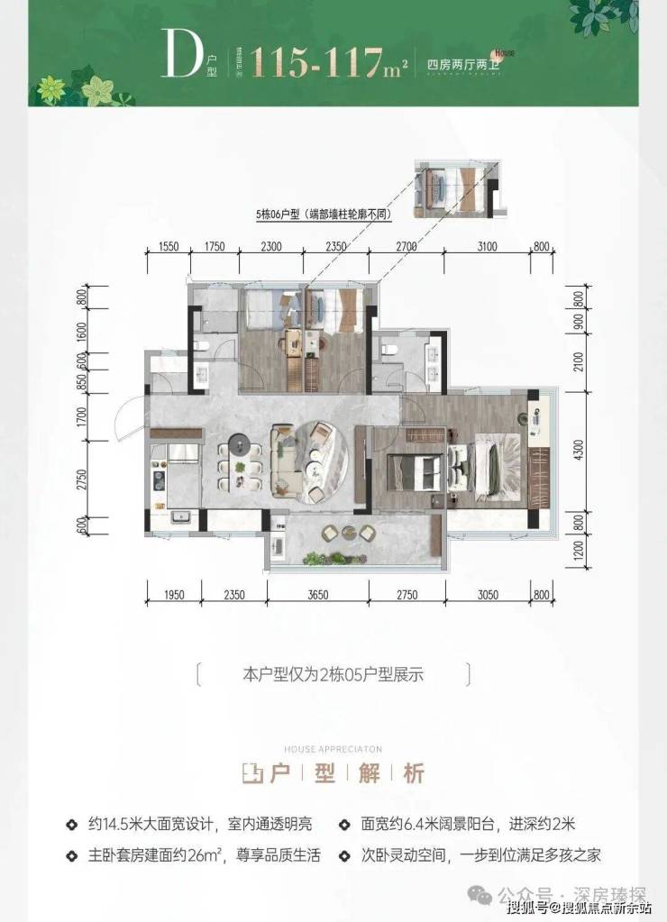 115-117㎡的4房2厅2卫,设计的是横厅南北通透格局,进门入户玄关,客餐厅6米开间,LDKB一体化设计,主卧套房双飘窗,分别做到了主卧20.83㎡/次卧8.74㎡/次卧8.93㎡/次卧8.25㎡(包含墙体飘窗),客厅连接次卧出12.8㎡的巨幕大阳台,U型厨房,科学双明卫,得房率约78.9%(不含赠送),阳台主朝东南向。套内面积92.08㎡+赠送面积21.55㎡=实得113.63㎡,加上赠送后得房率约98.44%。