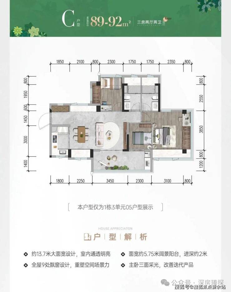 89-92㎡的3房2厅2卫,C户型,设计的是横厅南北通透格局,进门入户玄关,客餐厅5.7米开间,LDKB一体化设计,主卧套房双飘窗,分别做到了主卧18.5㎡/次卧7.7㎡/次卧6.9㎡(包含墙体飘窗),客厅连接次卧出11.5㎡的巨幕大阳台,U型厨房,科学双明卫,得房率约78.9%(不含赠送),阳台主朝东南向。套内面积71.4㎡+赠送面积22.8㎡=实得94.2㎡,加上赠送后得房率约105.22%。