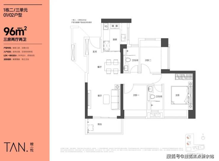 96㎡的3房2厅2卫,设计的是经典竖厅格局,LKDB一体化设计,进门入户玄关,动静分区,三开间朝南,有1个次卧做的双飘窗,U型厨房,得房率:74.34%(不含赠送),全部西南朝向。