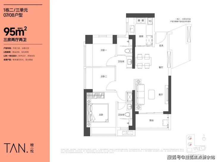 95㎡的3房2厅2卫,设计的是竖厅格局,LKDB一体化设计,进门入户玄关,有1个次卧做的双飘窗,U型厨房,卫生间三段式分离,得房率:74.34%(不含赠送),全部东南朝向。