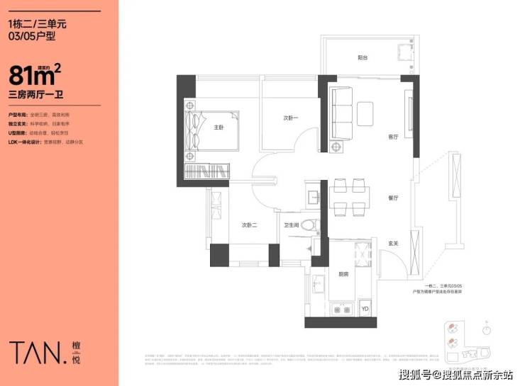 81㎡的3房2厅1卫,设计的是竖厅格局,LKDB一体化设计,进门入户玄关,有1个次卧做的双飘窗,U型厨房,卫生间三段式分离,得房率:74.34%(不含赠送),全部西北朝向。