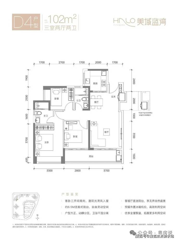 102㎡的3房2厅2卫,D4户型,经典竖厅格局,客厅3.7米开间,LDKB一体化设计,S墙设计预留冰箱卡槽位,U型厨房,卫生间干湿分离,三开间朝南,客厅连接次卧出6.4米长的观景大阳台约9.75m²,东南朝向看小区园林,得房率约75.3%(不含赠送),加上赠送得房率83.97%。