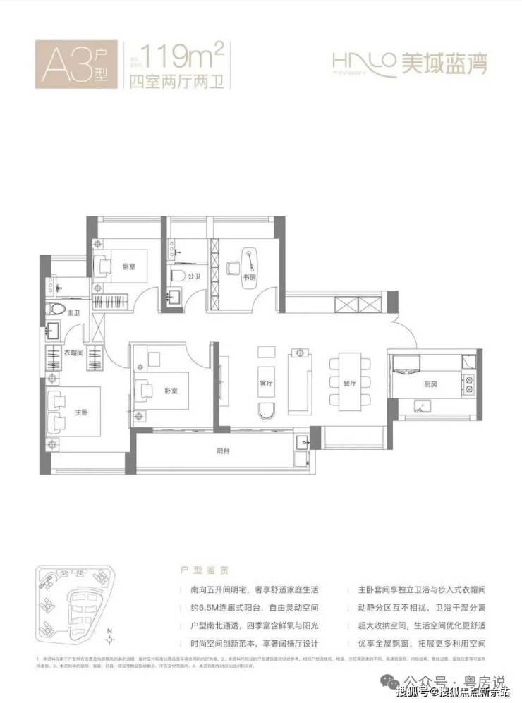 119㎡的4房2厅2卫,A3户型,横厅南北通透格局,客餐厅6.3米开间,LDKB一体化设计,五开间朝南,U型厨房,卫生间干湿分离,客厅连接次卧出6.5米长的观景大阳台约9.75m²,阳台主朝东南向,得房率约75.3%(不含赠送),加上赠送得房率90.48%。