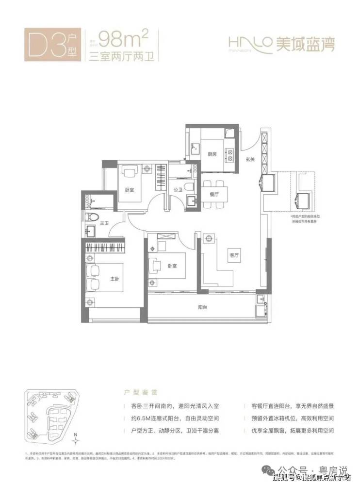 98㎡的3房2厅2卫,D3户型,经典竖厅格局,客厅3.7米开间,LDKB一体化设计,S墙设计预留冰箱卡槽位,动静分区,客厅连接次卧出6.5米长的大阳台,U型厨房,卫生间干湿分离,得房率约80.12%(不含赠送),东南朝向。