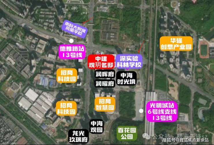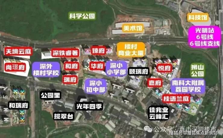 光明中心区的核心是科学公园,科学公园头排的新盘有满京华金硕系列、振业天境云庭和深铁睿著广场;其次是绿城桂语兰庭,靠近光明大街;最后是越秀星科启源,距离科学公园最远,超过1公里了,非光明中心区核心圈内;