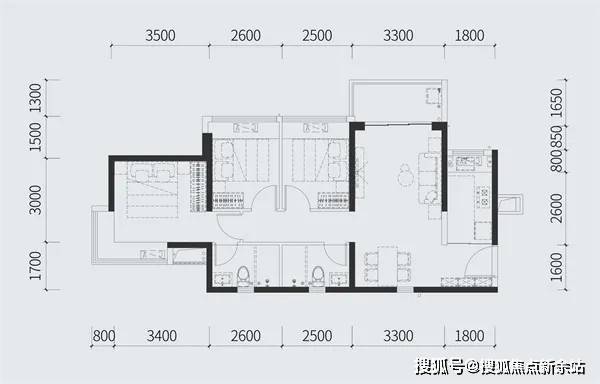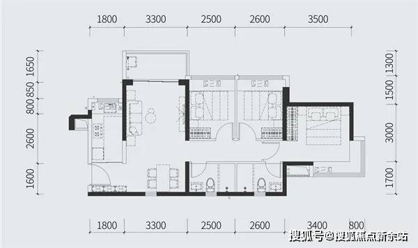 88㎡的3房2厅2卫,设计的竖厅格局,客厅3.3米开间,3个卧室分别是3.5米/2.6米/2.5米的宽度,主卧L型飘窗,L型厨房,得房率:77.73%(不含赠送),有西北或东北朝向。