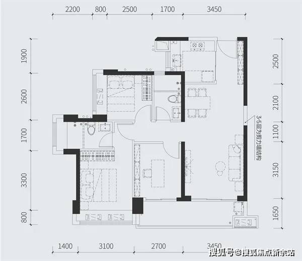 97㎡的3房2厅2卫,设计的竖厅格局,客厅3.45米开间,三开间朝南,3个卧室做到了3.1米/2.7米/2.5米的宽度,客厅连接卧室带6.15米长大阳台,U型厨房,得房率:77.73%(不含赠送),有东南向或西南朝向。